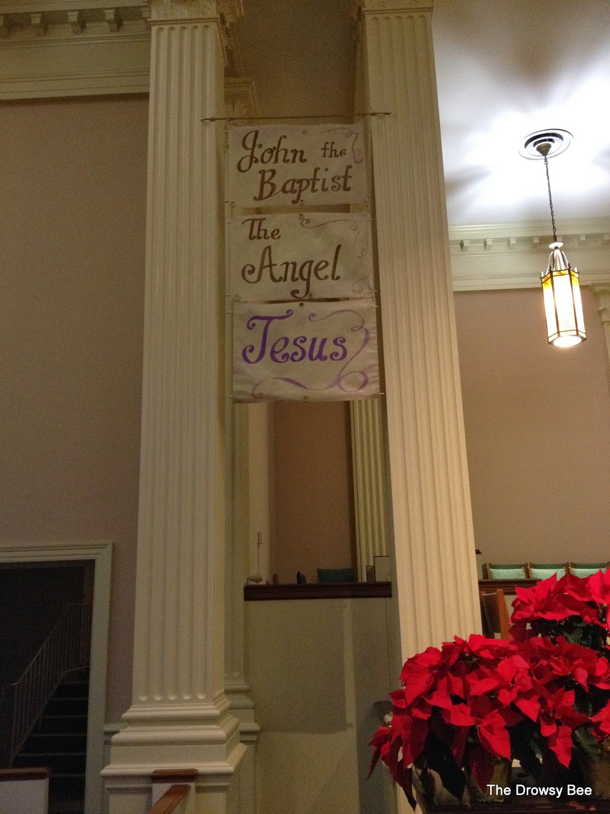Isn't our Sanctuary BEAUTIFUL at Christmas? People buy Poinsettias "in honor or memorial" of someone and after Christmas they can take it home. Any that are left behind get taken to local nursing homes or to shut-ins. If you look at the left edge of the photo you can see some banners hanging. Those are mine.There are also some on the right side but my photo skills could use some improvement.